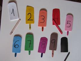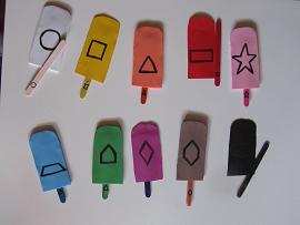 Por último pondremos en cada palito y en cada helado del mismo color un número y por el otro lado de ambos también una forma.